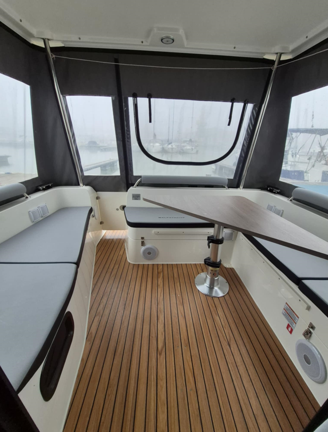 A prémium felszereltség része a bővített akku csomag, nagyobb orr farsugárkormány, elektromos horgony, felső vezető állás, nagyobb hűtő, meleg víz, + mikró, zárható bimini, tető keresőfény, nagy Raymarine navigáció, kürt, szúnyoghálók… a hajó színe szürke, igényes matracokkal és még rengeteg minden.